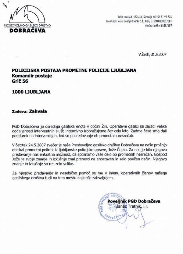 Prostovoljno gasilsko društvo Dobračeva iz Žiri se je Postaji prometne policije Ljubljana in policistu PPP Ljubljana Jožetu Čepinu pisno zahvalilo za predavanje o delu policistov pri obravnavi prometnih nesreč.