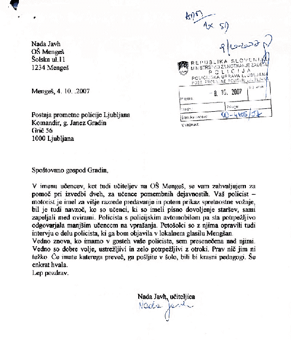 Osnovna šola Mengeš se je Postaji prometne policije Ljubljana zahvalila za predavanje o varnosti v cestnem prometu in prikaz spretnostne vožnje policista motorista za učence višjih razredov.