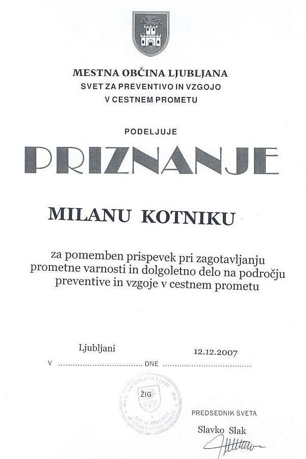 Objavljamo priznanje Mestne občine Ljubljana policijskemu inšpektorju PU Ljubljana Milanu Kotniku za uspešno delu na področju prometne varnosti.
