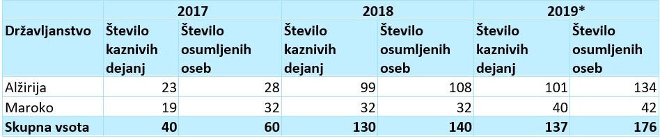 Statistični podatki tudi kažejo, da se povečuje delež državljanov Alžirije in Maroka, ki jih policija obravnava zaradi različnih kaznivih dejanj in prekrškov.