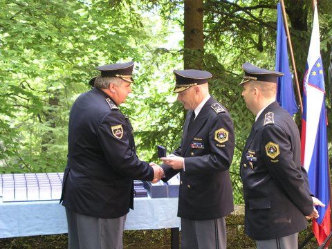 Generalni direktor policije Jože Romšek in direktor Uprave uniformirane policije na Generalni policijski upravi Danijel Žibret sta danes, 11. junija 2008, v Policijski akademiji v Tacnu podelila spominski znak, ki je bil posebej ustanovljen ob 60. obletnici Policijskega orkestra.
