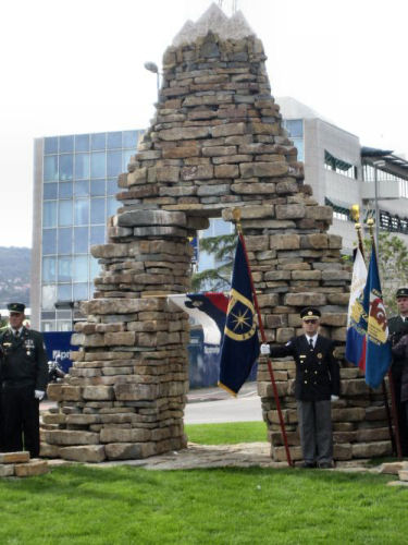 Otvoritev slavoloka samostojnosti v krožišču pred vhodom v Luko Koper, ob njem postrojeni praporščaki slovenskih veteranskih organizacij.