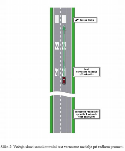 Na Ministrstvu za promet je bil danes, 10. septembra 2009, predstavljen t. i. dvosekundni samokontrolni test, s katerim lahko vozniki na slovenskih avtocestah že preizkusimo, ali vozimo na zadostni varnostni razdalji.