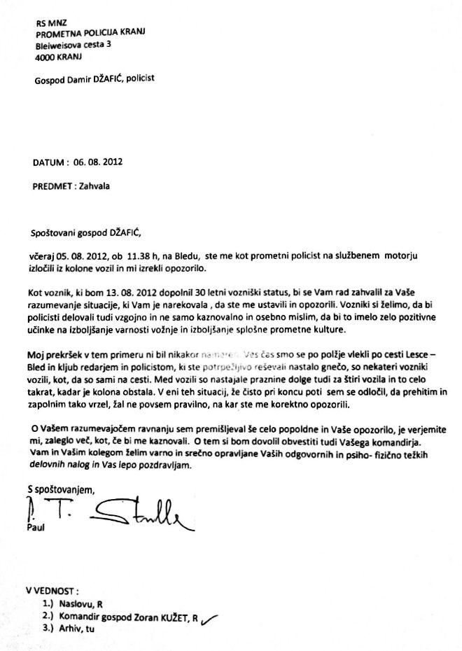 Zahvala občana policistu PPP Kranj