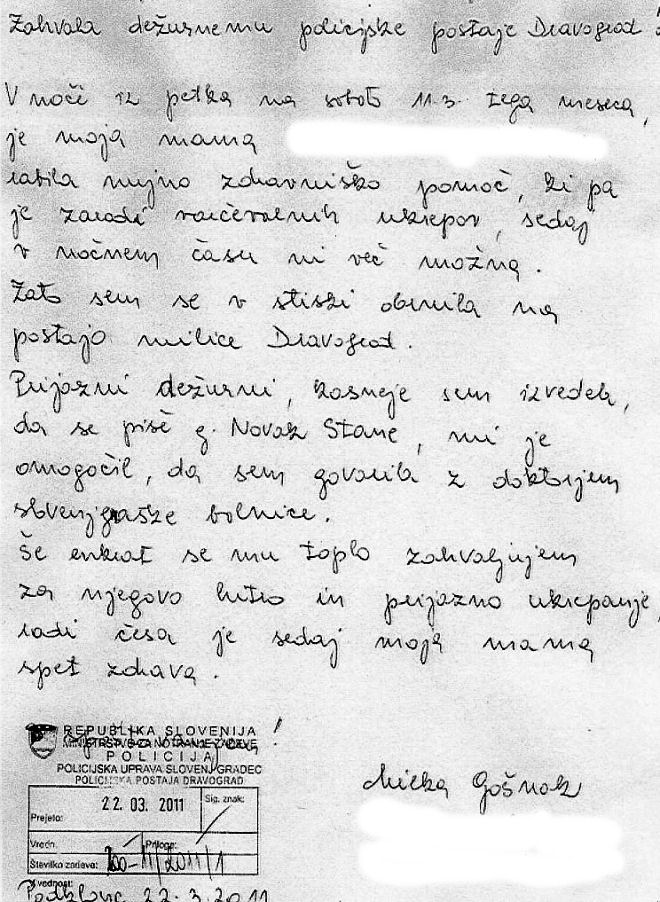 Občanka se dežurnemu policistu Policijske postaje Dravograd Stanetu Novaku zahvaljuje za pomoč in prijaznost.