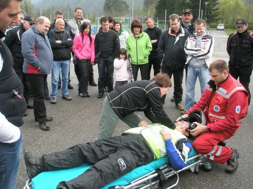 Reševalci Zdravstvenega doma Tolmin so praktično in teoretično zelo poučno pokazali postopke nudenja prve pomoči poškodovanim voznikom motornih koles na samem kraju prometne nesreče.