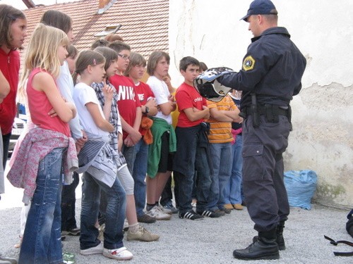 O varnosti v cestnem prometu in delu policista prometnika je učencem spregovoril Srečko Falkner s Postaje prometne policije Novo mesto, delo in vlogo policista vodnika službenega psa pri zagotavljanju varnosti pa sta predstavila vodnika službenega psa Gregor Lusavec in Rok Cvetko iz Sektorja uniformirane policije na PU Novo mesto.