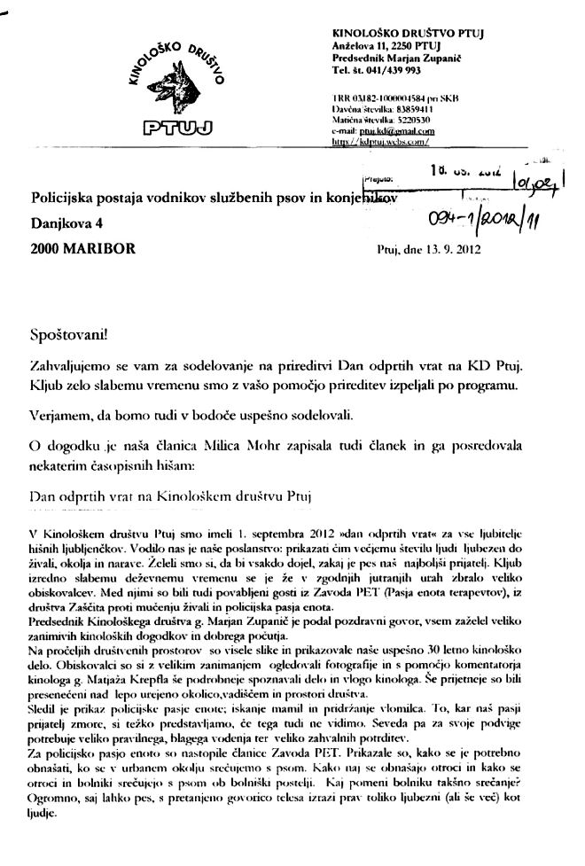Objavljamo zahvalo Kinološkega društva Ptuj policistom Policijske postaje vodnikov službenih psov in konjenikov Maribor za predstavitev njihove dela ob dnevu odprtih vrat kinološkega društva. Sodelovala sta policista vodnika službenih psov Zvonko Zajc in Vasja Fric.