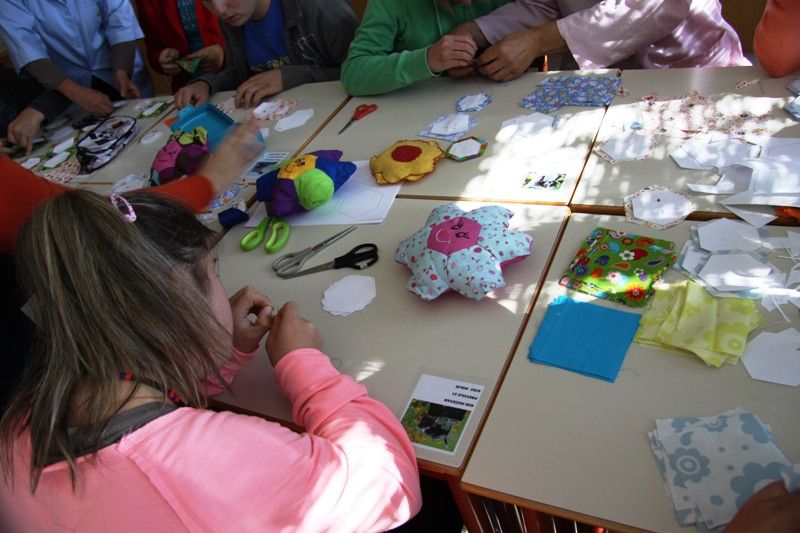 pogled na roke ki izdelujejo blazinice tolažbe, v ospredju je že izdelana blazinica